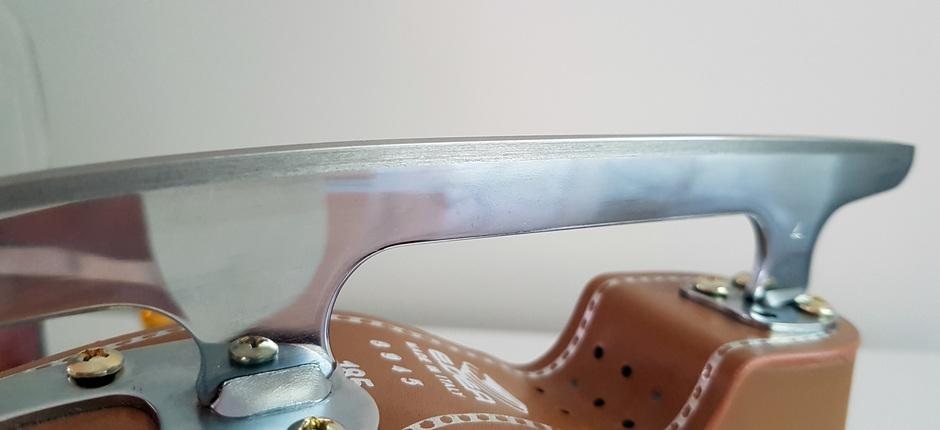 Tarkista asia näin: aseta luistinterä pöydälle ja paina kärkipiikki kiinni pintaan. Terän ja pöydän väliin jäävän valoraon tulisi olla tasaisen kaareva aina kärkipiikkeihin saakka. Terän etuosan profiilin kuuluu olla kupera, ei kovera tai suora. Jos kuoppa ulottuu liian pitkälle kärkipiikkeihin, piruetit alkavat “vaeltaa” — aivan kuten pallo, jossa on pieni kolhu.