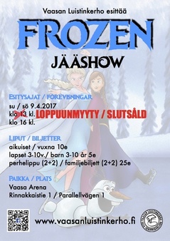 Tänä keväänä taitoluisteluseura Vaasan Luistinkerho Vasa Skrinnskoklubb ry:n kevätnäytöksenä luistellaan upea jääshow Frozen, jossa matkaamme Annan ja Elsan mukana huurteiseen Arendellen kylään. Kaikki seuramme luistelijat esiintyvät näytöksessä ja luvassa onkin upeita esityksiä sekä taitoluistelun lumoa!